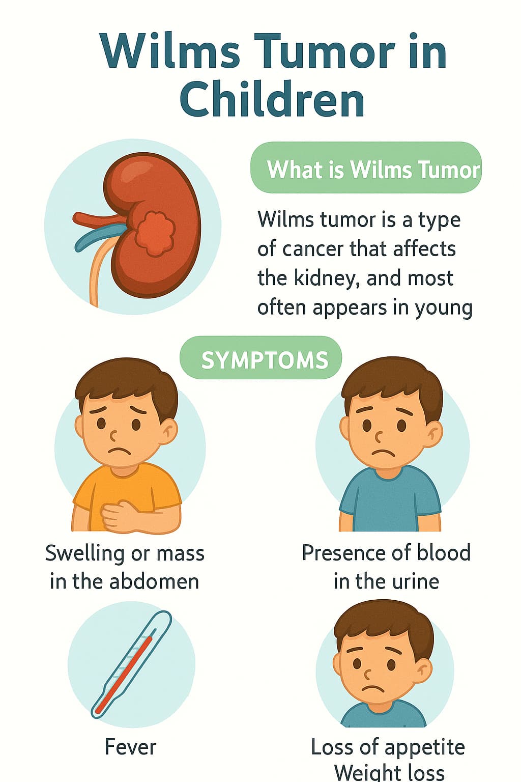 ورم ويلمز يعد من أكثر الأنواع شيوعًا حيث يمثل من 5 إلى 10% من سرطانات الأطفال، وهو ورم خبيث ينشأ من أنسجة الكلى غير الناضجة ويصيب الأطفال من سن 2 إلى 5 أعوام.